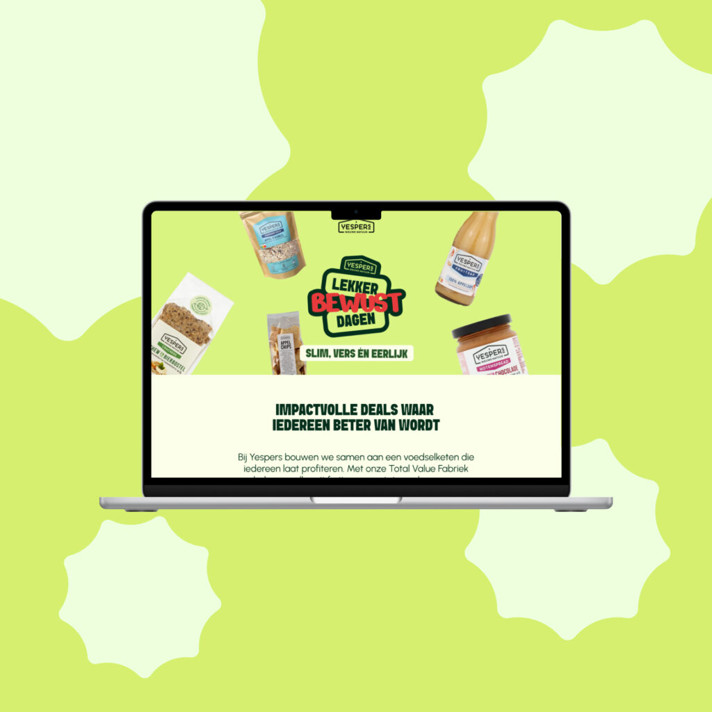 Om Yespers zichtbaar én relevant te maken op de beurs is er een communicatiecampagne ontwikkeld gebaseerd op het herkenbare concept van boodschappen doen — maar dan met impact. Onder de noemer “Boodschappen die kloppen” is de missie van Yespers doorvertaald naar een creatieve storytellinglijn met supermarkt-actietaal, spaarkaarten en opvallende beursvisuals. Impactvolle ‘aanbiedingen’ zoals minder verspilling of meer vezels, actiedagen rond producten uit de Total Value Fabriek en communicatiemiddelen die het vertrouwde winkelgevoel oproepen — zonder over korting te praten. Zo wordt het complexe verhaal van systeemverandering tastbaar, begrijpelijk en uitnodigend voor elke bezoeker.